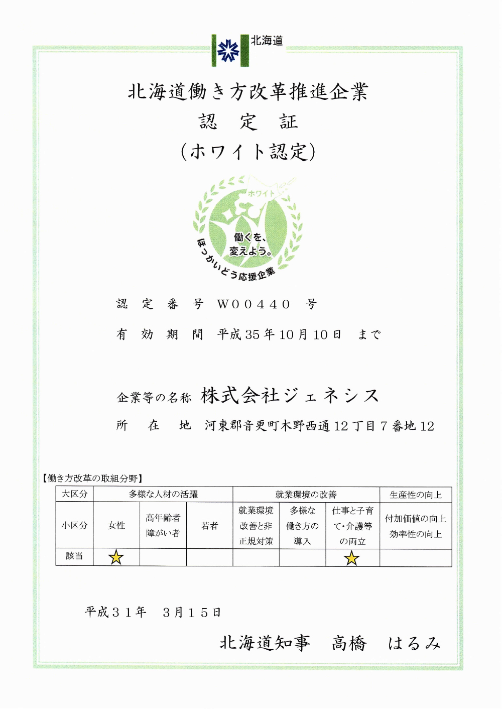 2019年3月15日北海道働き方改革推進企業認定制度「ホワイト認